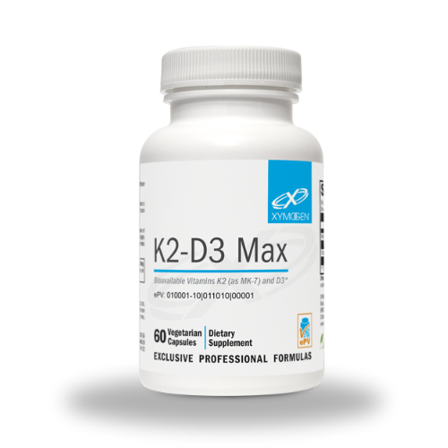 K2-d3 max is formulated for those who need a more substantial presence of vitamin k2, delivering 180 mcg per serving. The combination of highly bioavailable and bioactive menaquinone-7 (mk-7) with vitamin d3 provides complementary benefits for bone and cardiovascular health, . Clinical applications supports bone health, promotes carboxylation of bone proteins supports cardiovascular health, and arterial elasticity take one capsule daily, or use as directed by your healthcare professional. Consult your healthcare professional before use. Individuals taking blood thinners or other medication should discuss potential interactions with their healthcare professional. Do not use if tamper seal is damaged. Keep closed in a cool, dry place out of reach of children. Microcrystalline cellulose, capsule (hypromellose and water), ascorbyl palmitate, and silica.